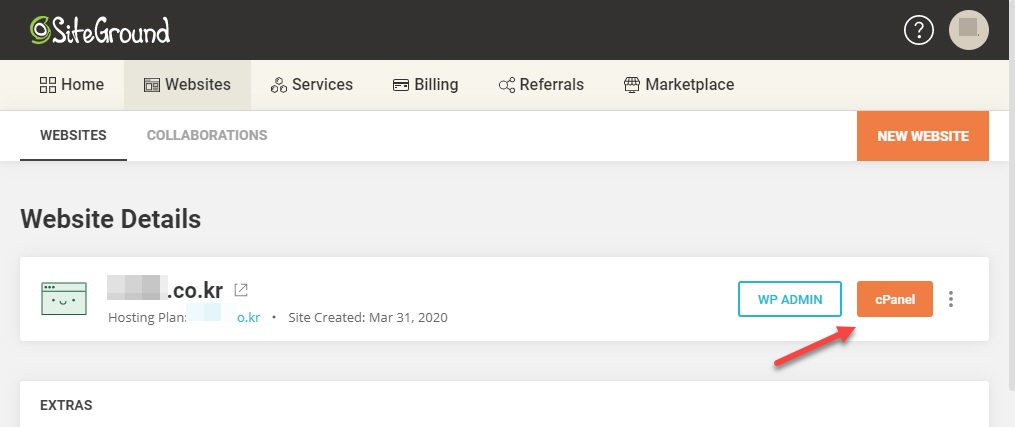 Site Tools로 전환되지 않은 경우 아래 그림처럼 cPanel 버튼이 표시됩니다.