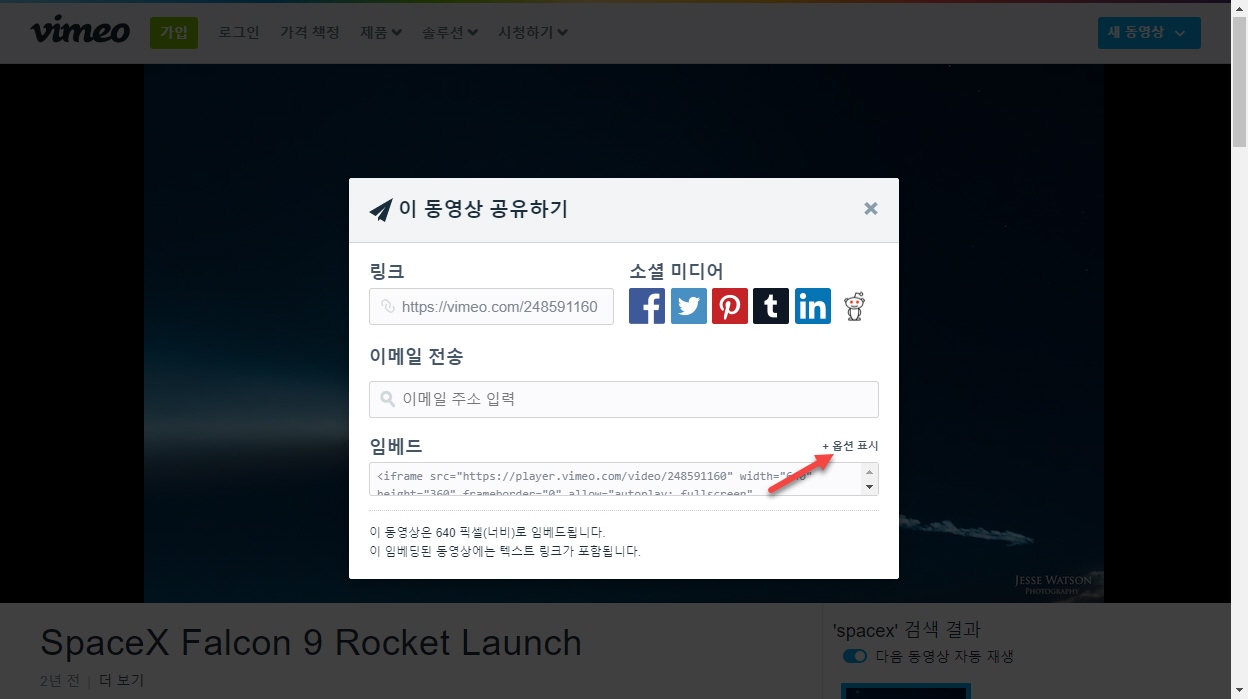 2. "이 동영상 공유하기" 팝업이 표시됩니다. 임베드 오른쪽의 "옵션 표시"를 클릭합니다.