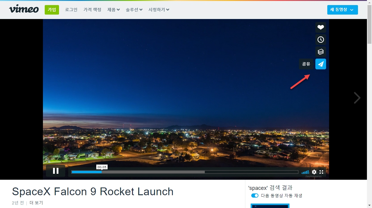 1. 공유하고자 하는 Vimeo 영상 내의 공유 아이콘을 클릭합니다.