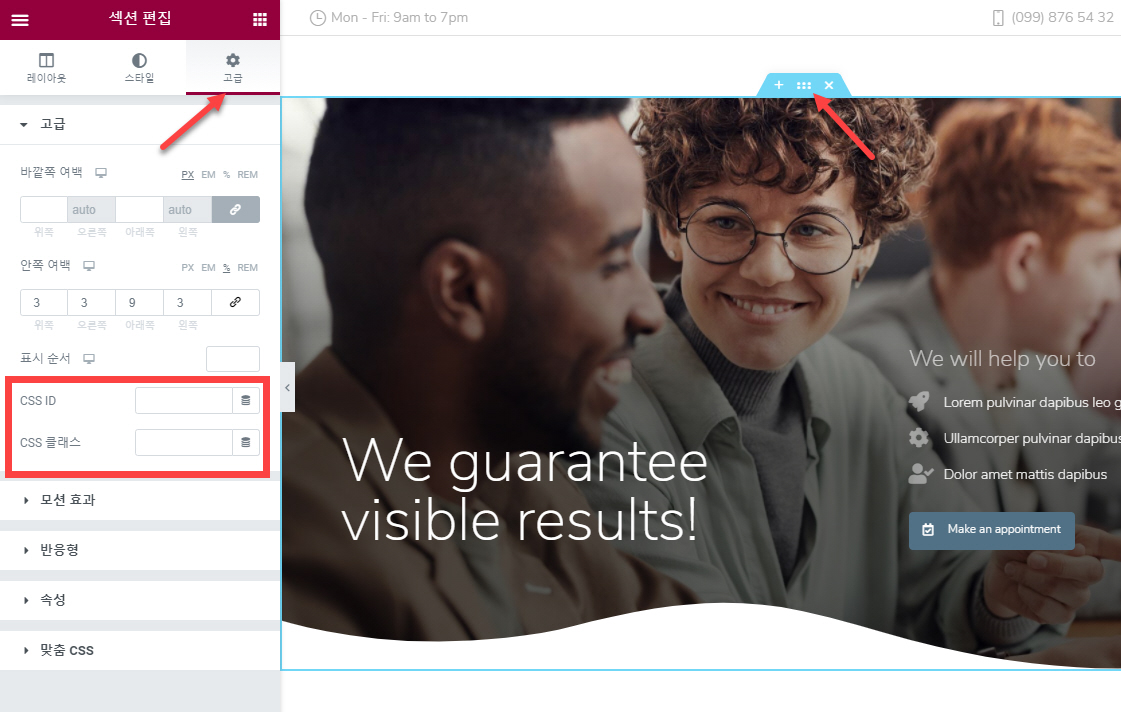 엘리멘터 섹션에 CSS 클래스/ID 추가하기