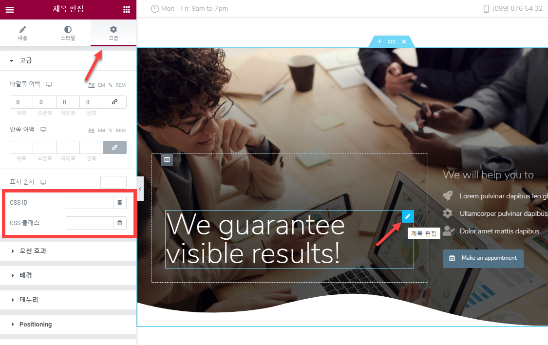 개별 요소(엘리먼트)에도 CSS ID와 CSS 클래스를 지정하는 것이 가능합니다. 개별 요소(아래의 그림에서는 "제목" 요소)를 클릭하고 오른쪽 상단에 표시되는 연필 모양의 아이콘을 클릭합니다. 그런 다음 고급 탭을 선택하면 CSS ID와 클래스를 지정할 수 있는 옵션이 표시됩니다.