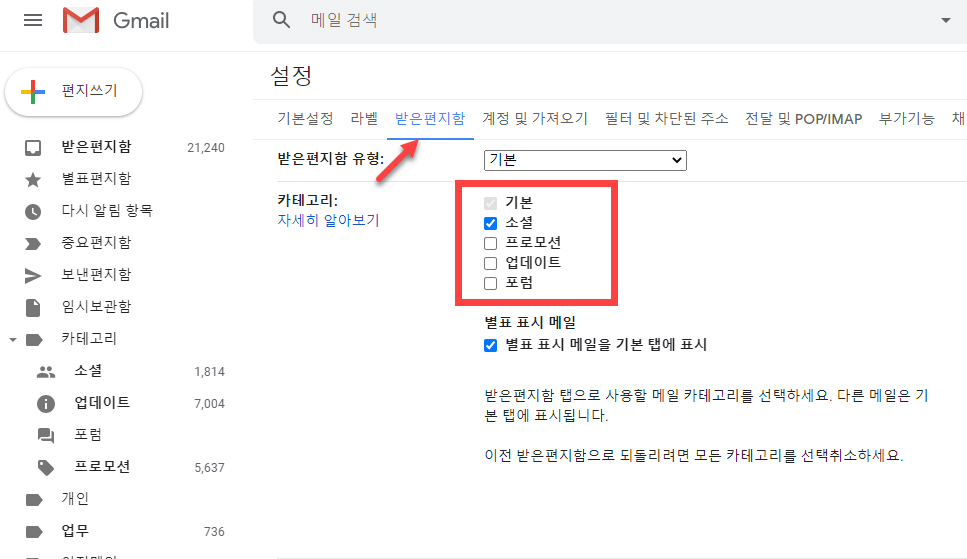 지메일 받은 편지함 '소셜', '프로모션' 카테고리 비활성화하기