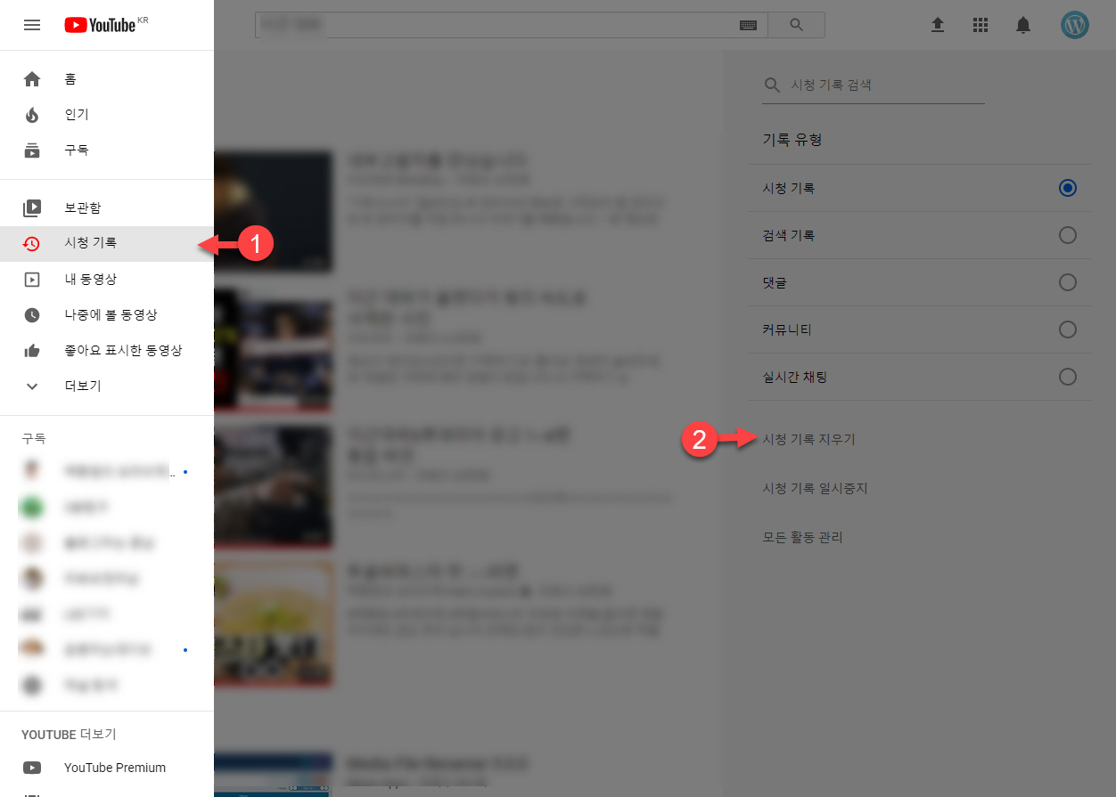 그런 다음 오른쪽의 시청 기록 지우기(②)를 클릭합니다.