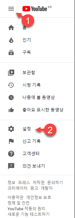 YouTube에 로그인한 후에 왼쪽 상단의 아이콘(①)을 클릭합니다. 그러면 왼쪽에 메뉴가 표시됩니다. 설정(②)을 클릭합니다.