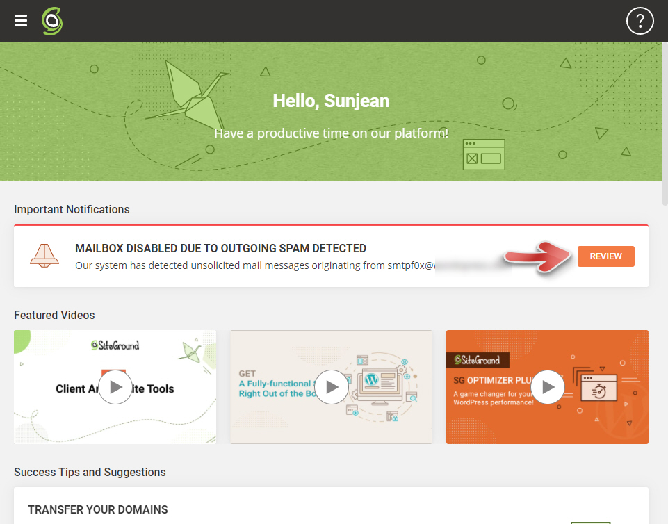 사이트그라운드에서 보낸 이메일 내용에 따라 문제가 되는 이메일 계정의 비밀번호를 변경하여 문제를 해결할 수 있습니다. 사이트그라운드에 로그인하면 MAILBOX DISABLED DUE TO OUTGOING SPAM DETECTED (스팸 발송이 감지되어 메일박스가 비활성화됨) 이라는 공지가 표시됩니다. REVIEW를 눌러 내용을 검토하고 메일 암호를 변경할 수 있습니다.