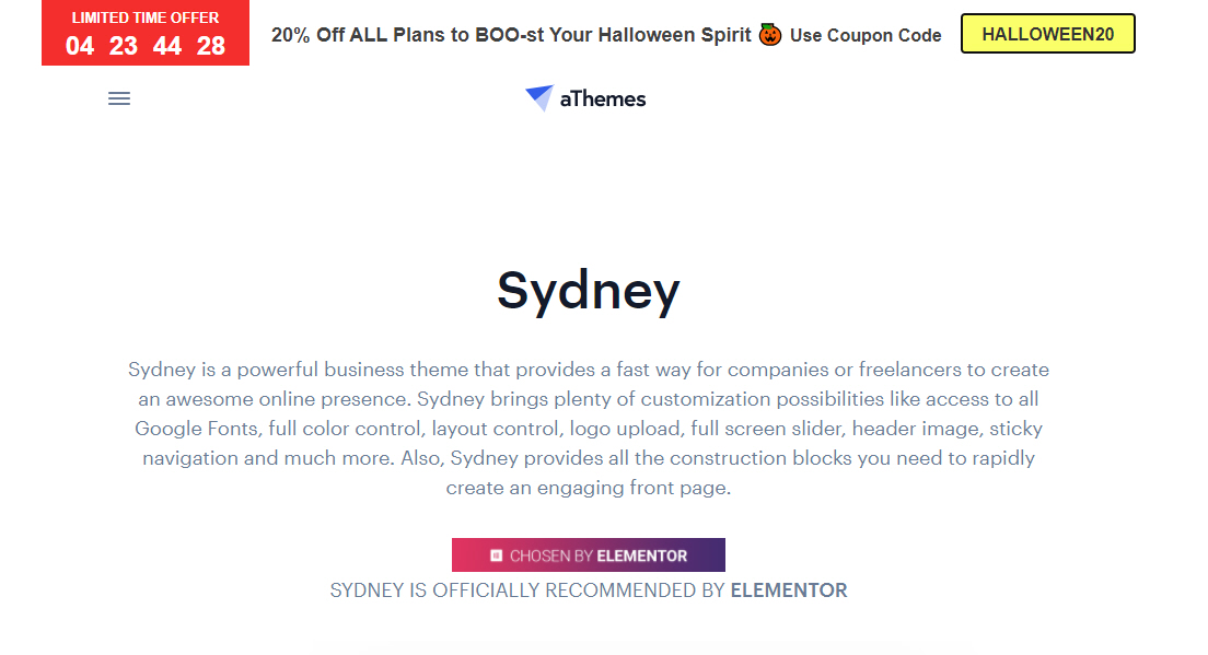 워드프레스 시드니 테마는 현재 10만 개가 넘는 사이트에 설치되어 사용되고 있습니다. Sydney 테마는 Page Builder by SiteOrigin이 사용되었지만 지금은 엘리멘터 페이지 빌더를 기본 페이지 빌더로 사용하고 있습니다. 시드니 테마가 할로윈 데이를 맞이하여 20% 할인 행사를 진행하고 있습니다.