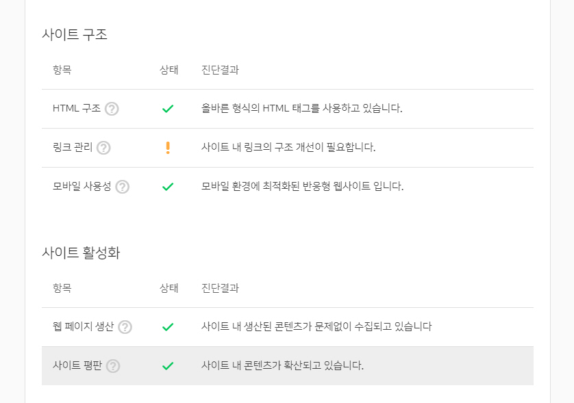 네이버 웹마스터 도구의 리포트 > 사이트 최적화에서 사이트 최적화 상태를 확인할 수 있습니다. 이 티스토리 블로그를 비롯하여 워드프레스 사이트 등 대부분의 사이트에 대하여 '사이트 구조'의 'HTML 구조' 상태에 X 표시가 되어있습니다.