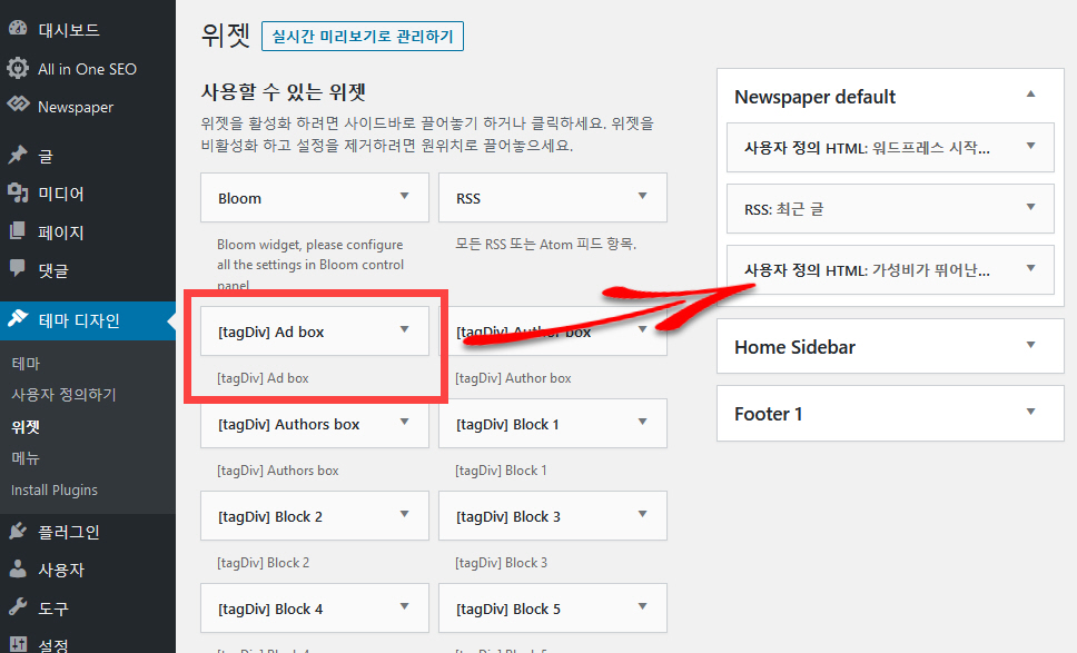 Theme panel의 ADS 섹션에서 광고를 설정했다면, 수동으로 원하는 위치에 광고를 추가하는 것이 가능합니다. 사이드바에 광고를 표시하고 싶은 경우에는 테마 디자인 > 위젯에서 [tagDiv] Ad box를 표시하고자 하는 위젯 영역으로 끌어다 놓습니다.