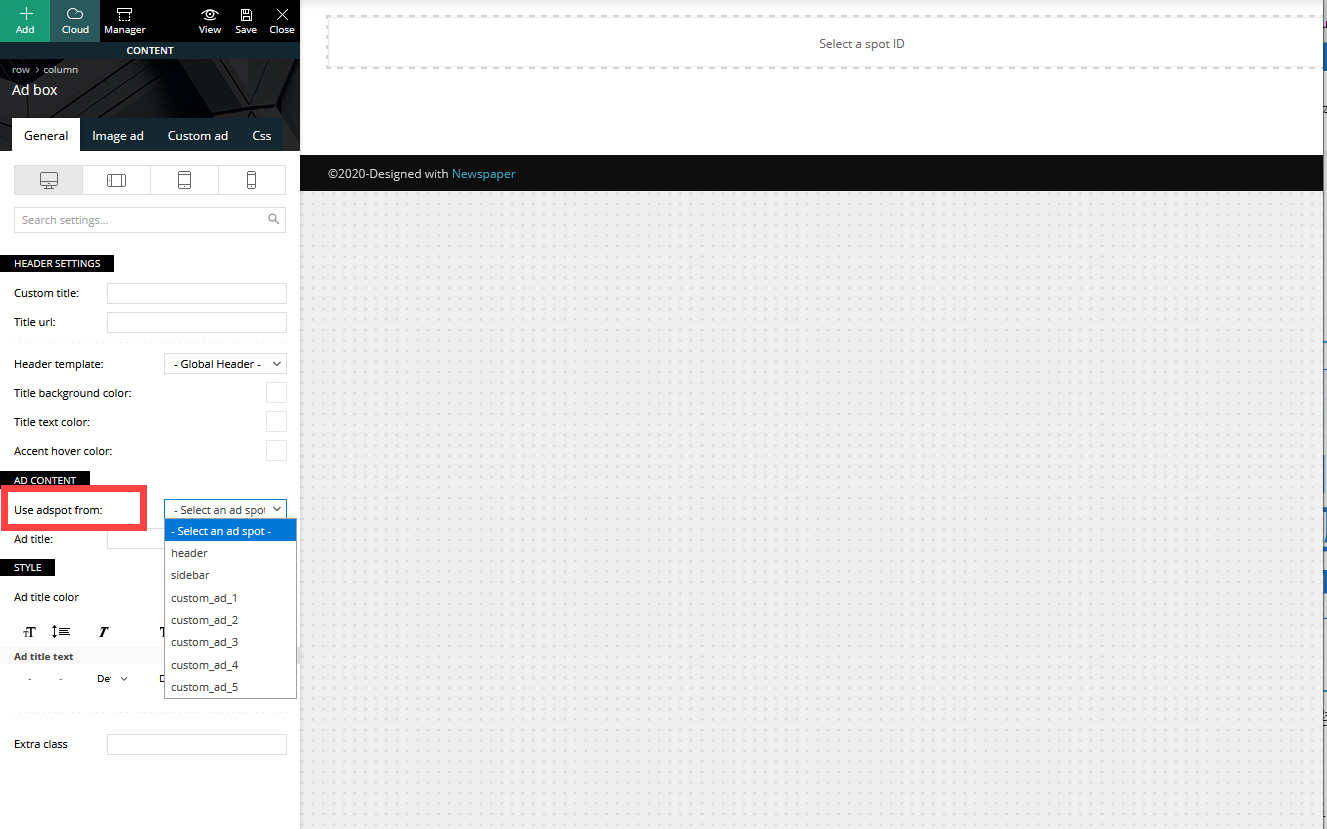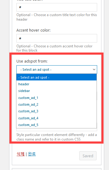 왼쪽의 Ad box 설정 패널: AD CONTENT 아래의 Use adspot from에서 원하는 광고 위치(이름)를 선택합니다.