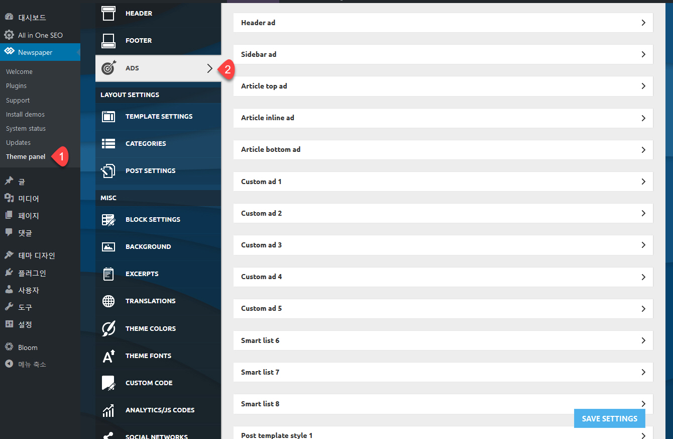 뉴스페이퍼 테마에서 구글 애드센스 (AdSense) 광고를 배치하려면 Newspper > Theme panel > ADS를 클릭합니다.