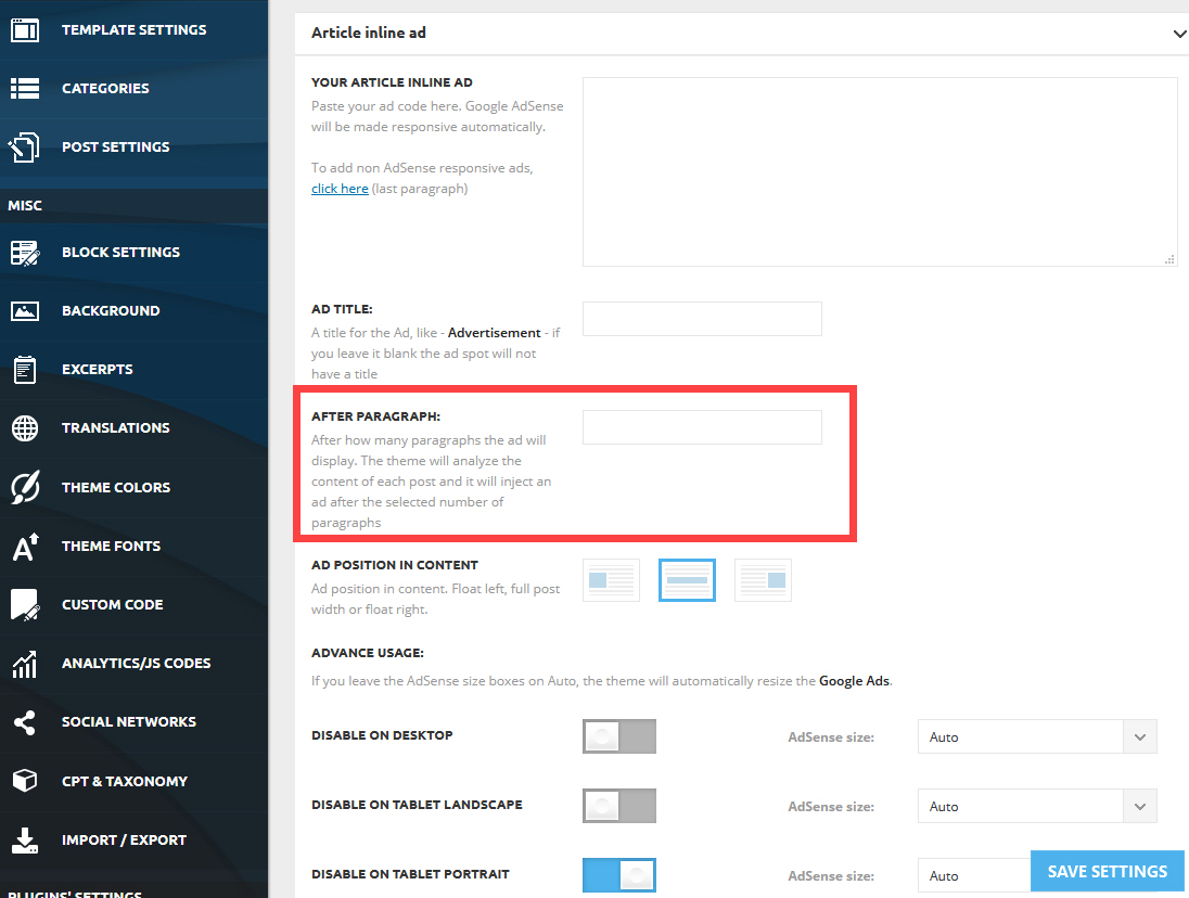After paragraphp (단락 뒤) 섹션에 광고가 몇 번째 단락(문단) 뒤에 표시되도록 할 것인지 설정할 수 있습니다.
