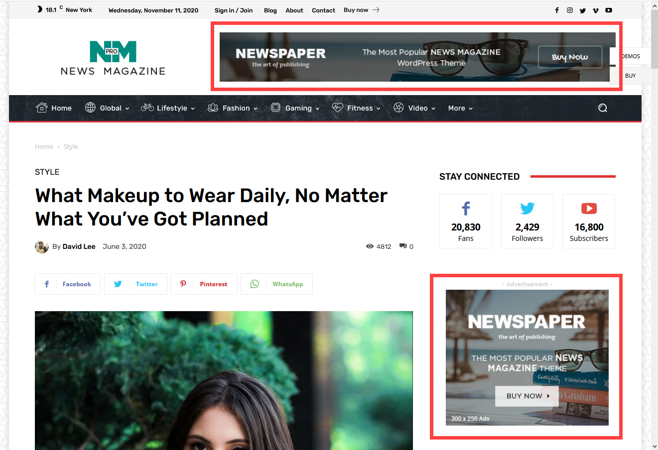 뉴스페이퍼의 기본 템플릿을 사용하는 경우 Header Ad에 광고 코드를 설정하면 선택하는 헤더 스타일에 따라 광고가 헤더 부분에 표시됩니다.