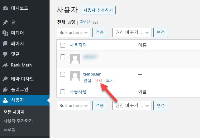 사용자명 위에 마우스를 올리고 삭제를 클릭하여 사용자를 삭제할 수 있습니다.