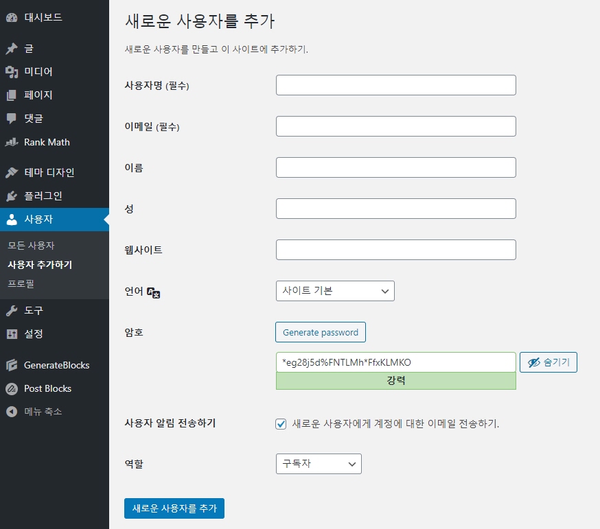 사용자명과 이메일을 기재하고 암호를 새로 생성하거나 생성된 암호를 그대로 사용합니다. 사용자 알림 전송하기의 "새로운 사용자에게 계정에 대한 이메일 전송하기" 체크란을 해제합니다. 그리고 역할을 "관리자"로 설정합니다.