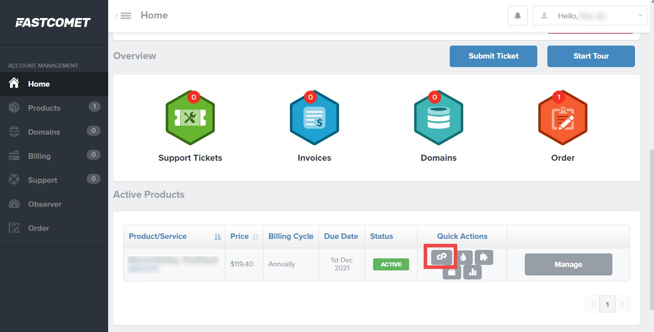 FastComet 홈페이지에 로그인한 다음, Active Products (사용 중인 제품) 섹션으로 이동합니다. 이용 중인 상품들이 나열되어 있습니다. 해당 상품의 Quick Actions (빠른 작업) 란의 cPanel 아이콘을 클릭합니다.