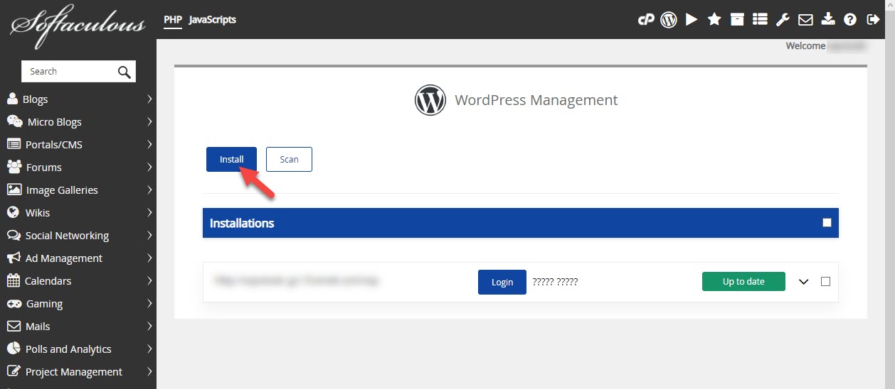설치된 워드프레스 사이트 리스트가 표시됩니다. Install을 클릭합니다.