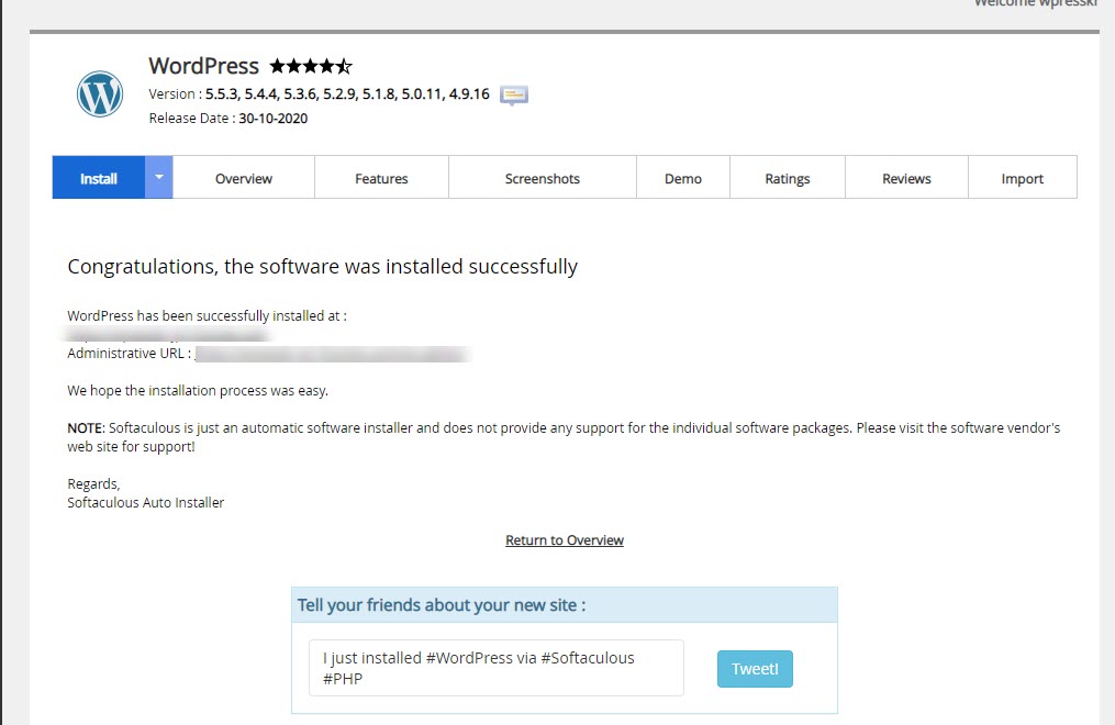 설치가 완료되면 설치된 워드프레스 사이트 URL과 관리자 URL 등의 정보가 표시되고 동일한 정보가 이메일로도 전송됩니다.