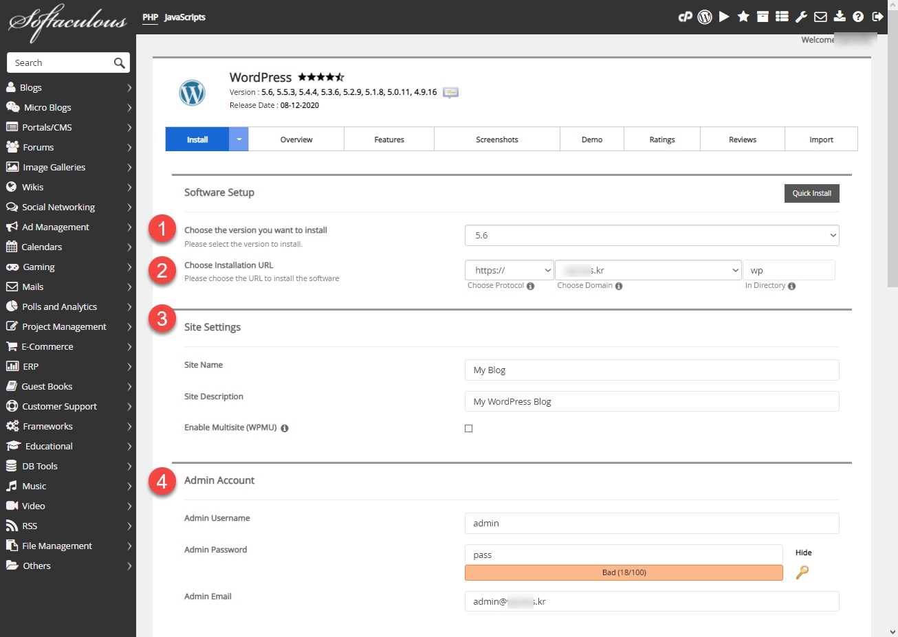 Choose the version you want to install(①)에서 설치하려는 워드프레스 버전을 선택합니다. 현재 최신 버전은 WordPress 5.6입니다.