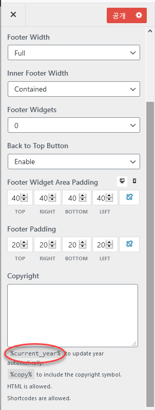 하지만 위의 방법은 테마 파일을 수정해야 하기 때문에 번거롭고, 초보자에게는 쉽지 않을 수 있습니다. 유료 테마를 사용한다면 일부 테마에서는 푸터의 카피라이트(Copyright) 섹션에서 동적인 연도(자동 연도)를 사용할 수 있는 변수를 제공하기도 합니다.
