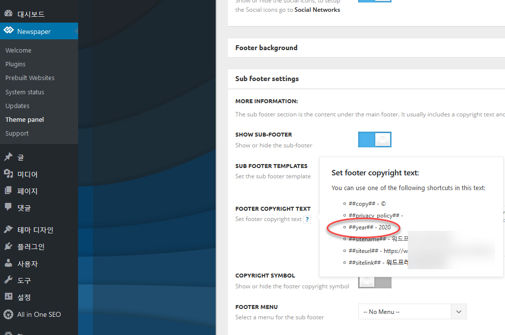 예를 들어, 인기 매거진 테마인 뉴스페이퍼 테마의 경우 Newspaper > Theme panel > Footer에서 푸터와 저작권 문구를 설정할 수 있습니다. 푸터 저작권 텍스트(Footer Copyright Text)를 설정할 때 ##year##를 사용하면 현재 연도가 자동으로 삽입됩니다. (이외에도 ##copy##, ##privacy_policy##, ##sitename##, ##siteurl##, ##sitelink## 등의 변수를 사용할 수 있습니다.)