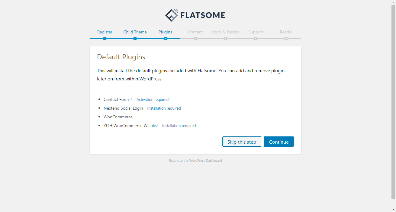 기본 플러그인 설치 화면이 표시됩니다. Contact Form 7, Nextend Social Login, WooCommerce, YITH WooCommerce Whishlist가 기본적으로 포함되어 있습니다. Continue를 클릭합니다.