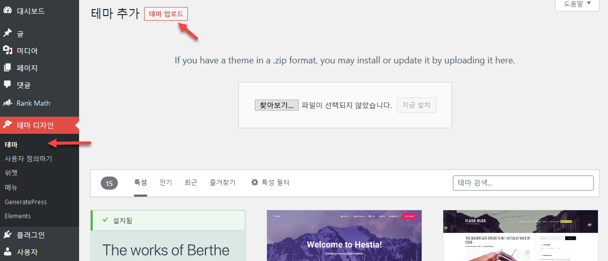 워드프레스 관리자 페이지에서 테마 디자인 > 새로 추가 (Add New) > 테마 업로드를 클릭하여 다운로드한 테마 파일을 업로드하여 설치합니다.