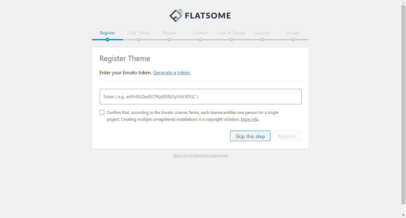 테마 등록 페이지가 표시됩니다. Generate a token (토큰 만들기) 링크를 클릭하여 토큰을 생성하여 빈칸에 입력하고 Confirm that... 체크란을 체크하고 Register (등록)를 클릭합니다. 테마 정품 인증을 하지 않으려면 Skip this step (이 단계 건너뛰기)을 선택합니다. 정품 인증을 하지 않으면 일부 기능(업데이트, 지원 등)이 제한됩니다.