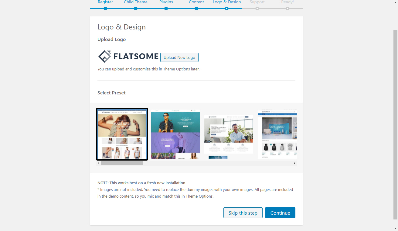 로고 & 디자인 선택 화면이 표시됩니다. 로고를 업로드하고 데모(Preset)를 선택합니다. 로고를 업로드하지 않으면 Flatsome 로고가 사용됩니다. 나중에 회사 로고로 교체할 수 있습니다.
