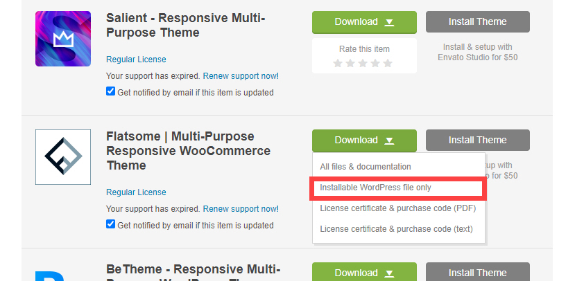 먼저 Flatsome 테마의 설치 파일을 다운로드합니다. 구입한 테마 다운로드 페이지에서 Download > Installatable WordPress file only를 클릭하여 설치 파일만 다운로드합니다. 설명서를 포함한 모든 파일을 다운로드하려면 All files & documentation을 클릭합니다. 모든 파일을 다운로드하면 압축을 해제하여 설치 파일만 업로드하여 설치해야 합니다.