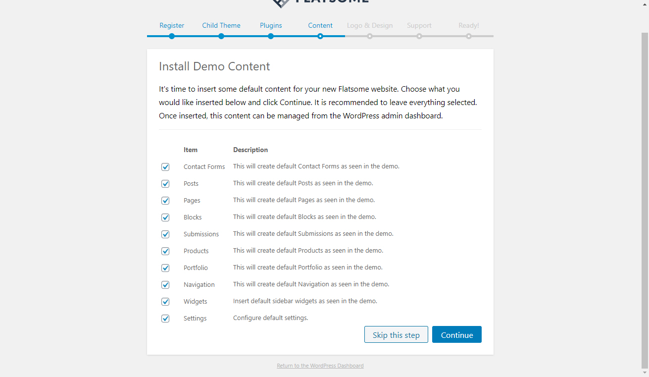 데모 콘텐츠 설치 화면이 표시됩니다. 설치할 콘텐츠를 선택하고 Continue를 클릭합니다.