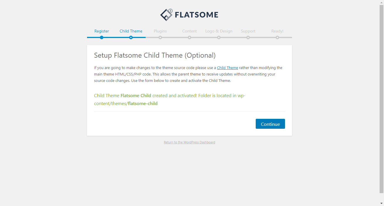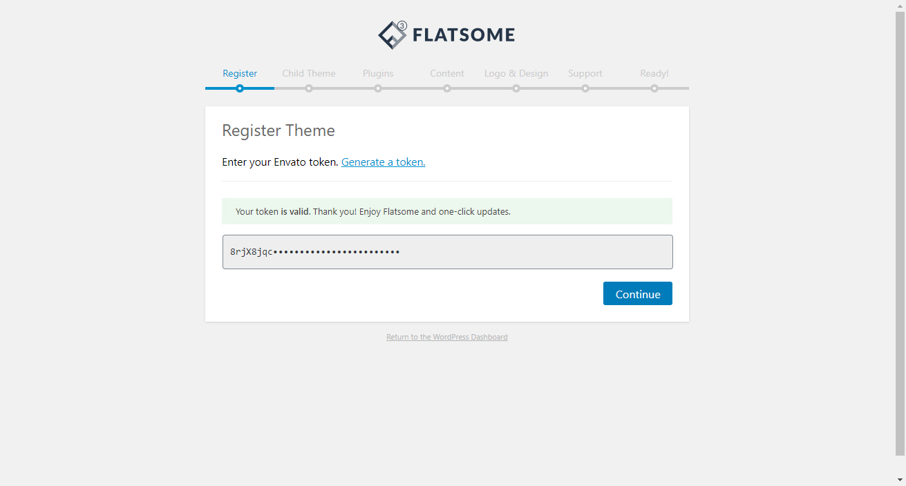 올바른 토큰을 입력하면 "Your token is valid. Thank you! Enjoy Flatsome and one-click updates" 문구가 표시됩니다. Continue를 클릭합니다.