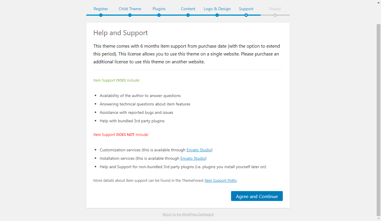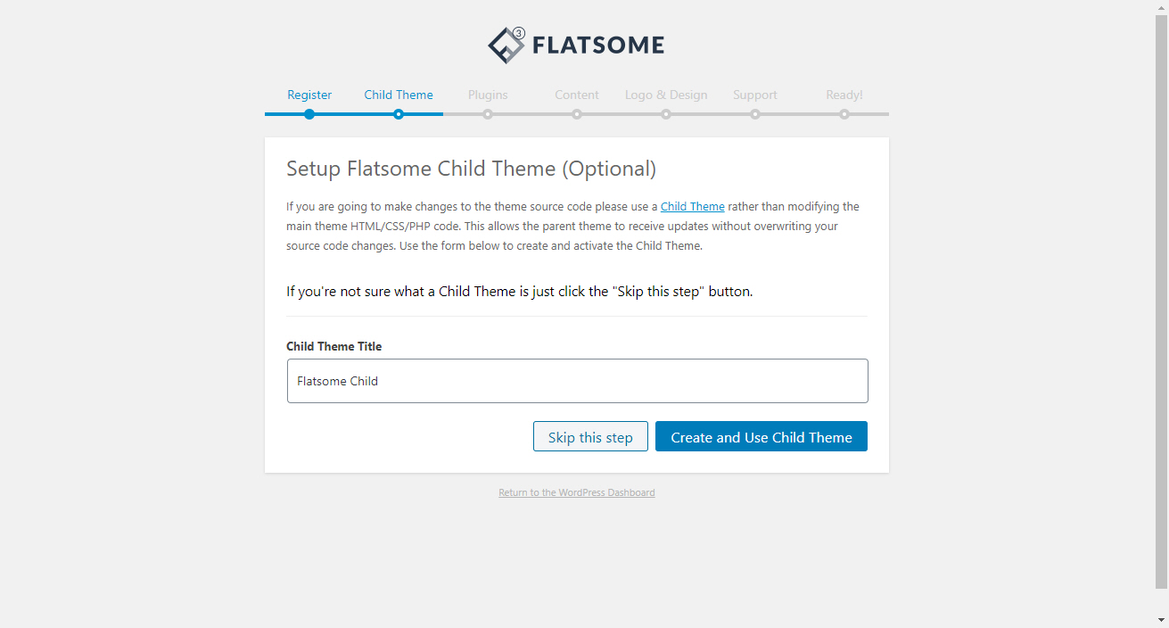 차일드 테마 설치(옵션) 페이지가 표시됩니다. Create and Use Child Theme을 선택합니다.