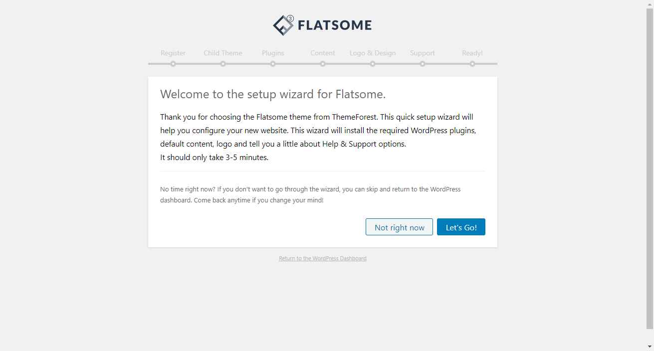 그러면 플랫썸 테마 설치 마법사 페이지가 표시됩니다. Let's Go!를 클릭합니다.