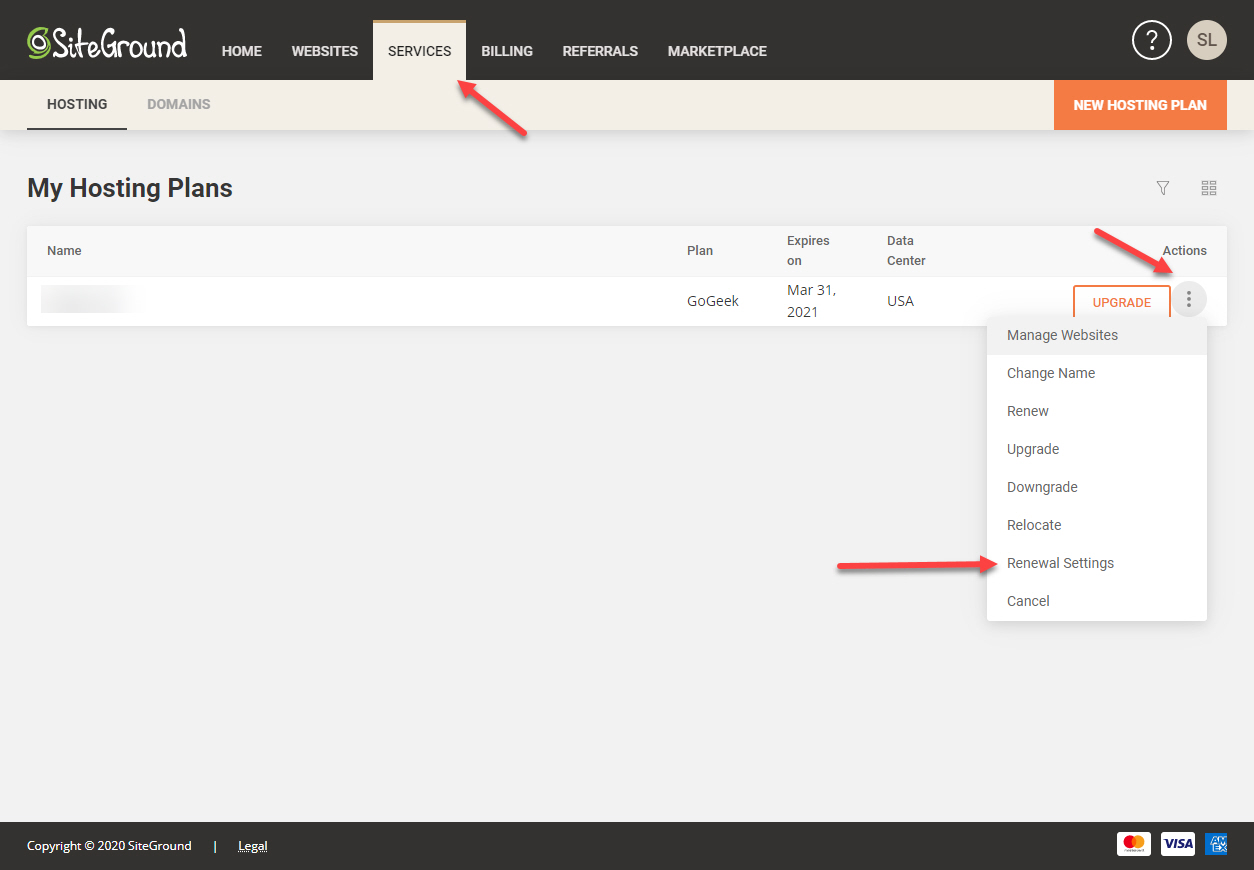 그러면 내 호스팅 상품(My Hosting Plans)이 표시됩니다. 취소할 상품 옆의 Actions 아래에 있는 세개 점으로 된 아이콘을 클릭한 다음 Renewal Settings를 클릭합니다.
