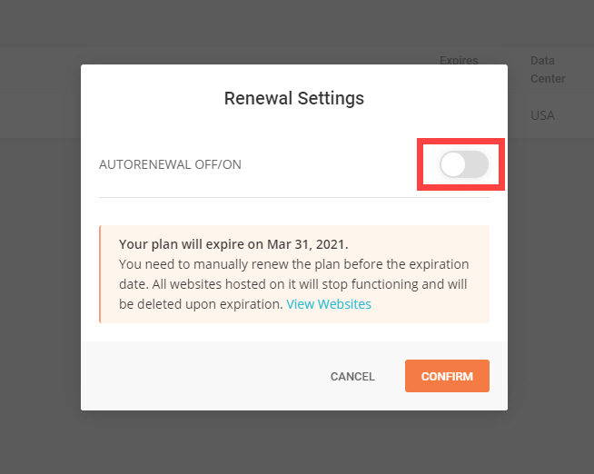 Renewal Settings 팝업 창이 표시되면 Autorenewal Off/On의 설정을 Off로 바꾸면 자동 갱신이 취소됩니다.