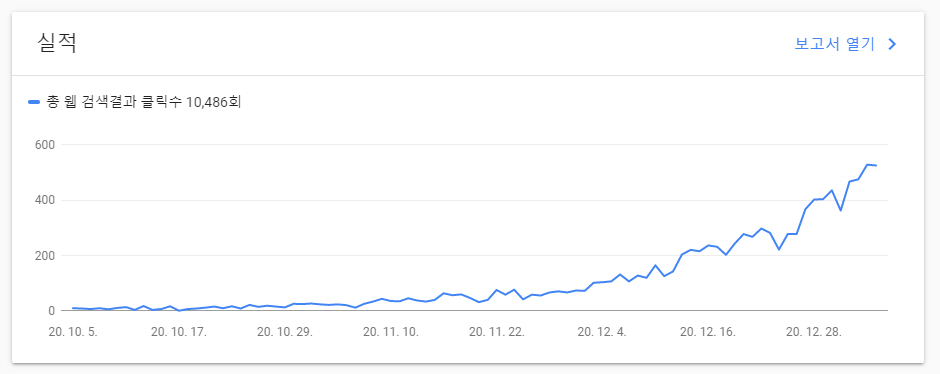 5개월째가 되면서 하루 방문자 수가 500~600명까지 증가했습니다. 아래 그래프는 구글 검색 결과 클릭수를 보여줍니다.