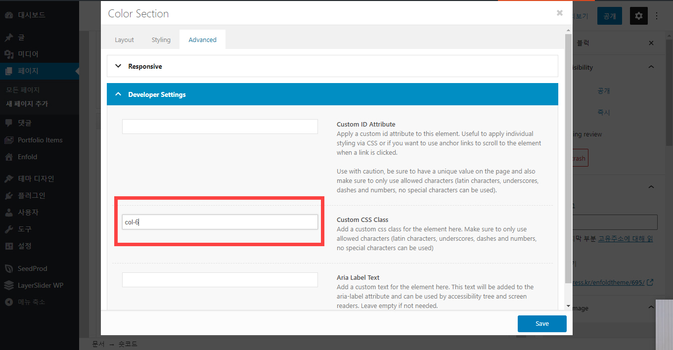 그런 다음 Color Section 편집 아이콘을 클릭하고 Advanced의 Custom CSS Class 섹션에 col-6을 입력하고 저장합니다.