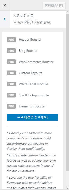 무료 버전을 사용하는 기능이 제한되어 있으므로, CSS 등을 사용하여 미흡한 점은 조정할 수 있을 것입니다. Neve 테마의 PRO 버전에서는 헤더, 블로그, 레이아웃, 우커머스 등과 관련된 추가 기능을 이용할 수 있습니다.