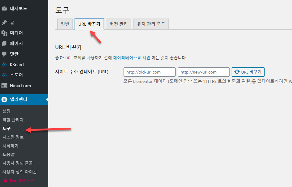 그리고 엘리멘토(Elementor)를 사용하는 경우에는 엘리멘터 > 도구 > URL 바꾸기에서 사이트 주소를 업데이트하도록 합니다.