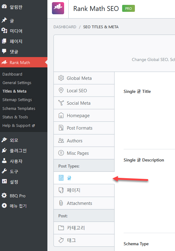 그런 경우 Rank Math > Titles & Meta> 글을 클릭하고,
