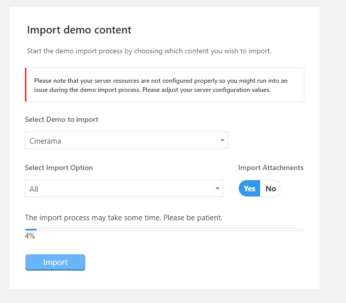 이제 다시 Import 페이지에서 데모 로드를 시도할 수 있습니다.