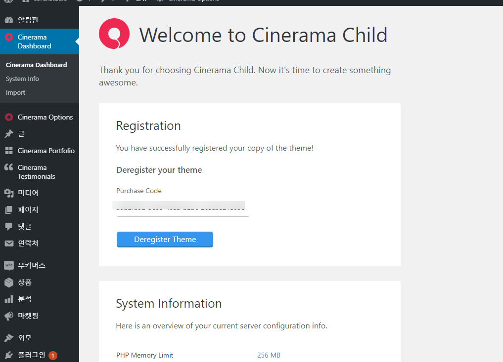 Purchase Code와 이메일 주소를 입력하고 Register Theme 버튼을 클릭하면 아래 그림과 같이 테마가 등록됩니다.