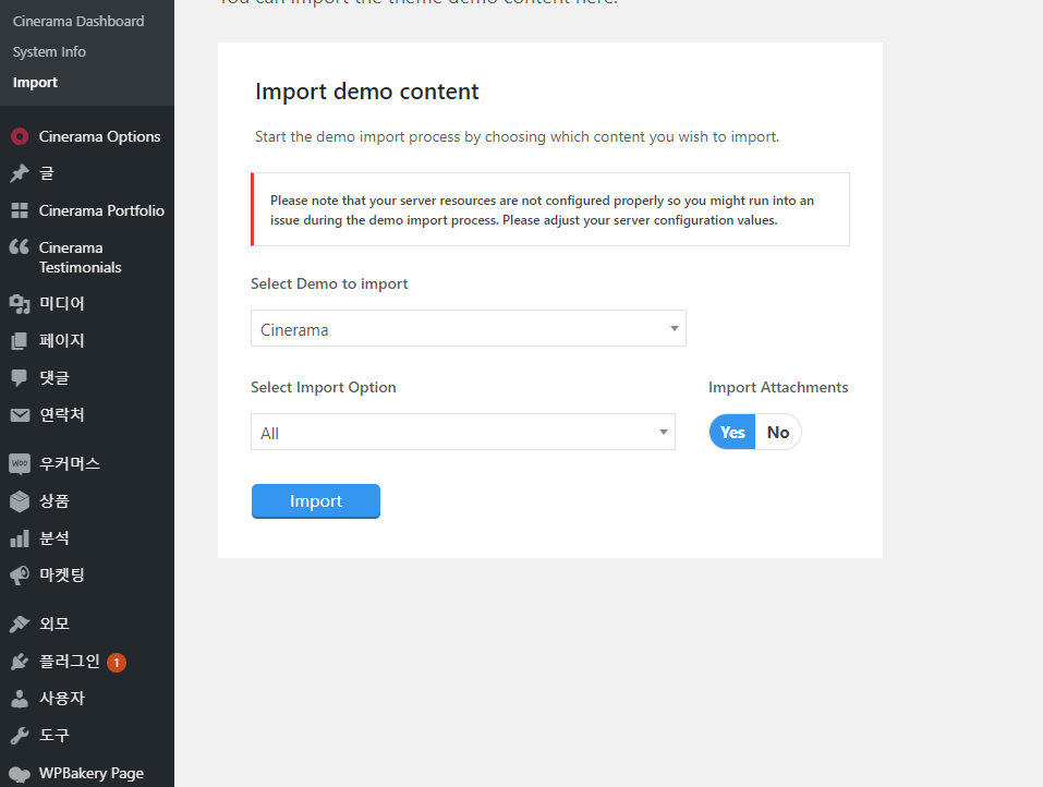 테마를 설치한 후에 활성화하고 필요한 플러그인을 설치하도록 합니다. 그런 다음 Cinerama Dashboard > Import를 클릭합니다.
