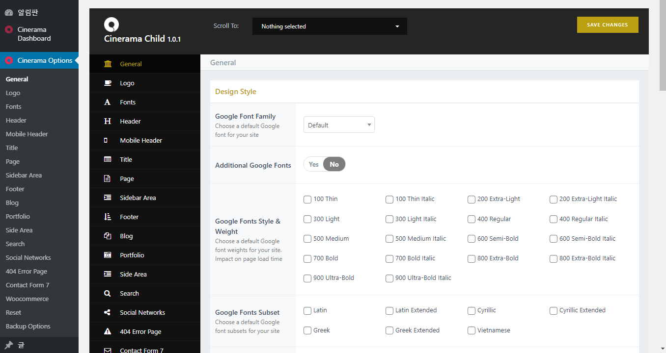 이 테마는 다양한 테마 옵션을 제공합니다. 테마 옵션은 워드프레스 관리자 페이지 > Cinerama Options에서 설정할 수 있습니다.