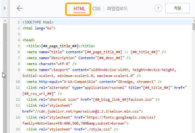 HTML 탭에서 아래 코드 부분을 찾도록 합니다.