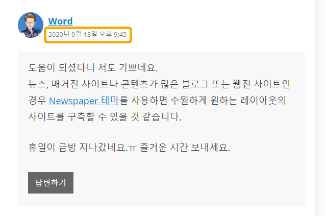 GeneratePress 테마의 댓글 섹션을 살펴보면 아래 그림과 같이 댓글 날짜가 "2020년 9월 13일 at 오후 9:45"와 같은 형식으로 되어 있습니다.