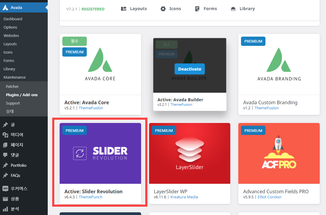 아바다 테마와 같은 유료 테마에 포함된 슬라이더 레볼루션 플러그인을 사용하는 경우에는 테마 판매자를 통해 업데이트된 플러그인을 받아야 합니다.