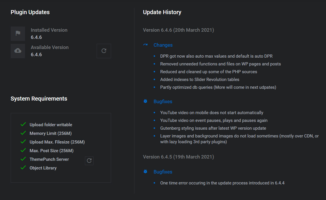 슬라이더 레볼루션의 최신 버전이 필요한 경우 테마 개발자에게 요청해보면 '테마와의 호환성을 테스트한 후에 제공할 것'이라는 답변을 받게 될 것입니다. 경우에 따라서는 업데이트된 플러그인 파일을 제공하는 테마 개발자도 있습니다.