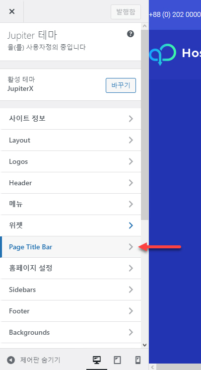 워드프레스 대시보드에서 외모 > 꾸미기 > Page Tible Bar를 클릭합니다. 워드프레스 버전에 따라 "외모 > 꾸미기" 대신 "테마 디자인 > 사용자 정의하기"로 표시될 수 있습니다.