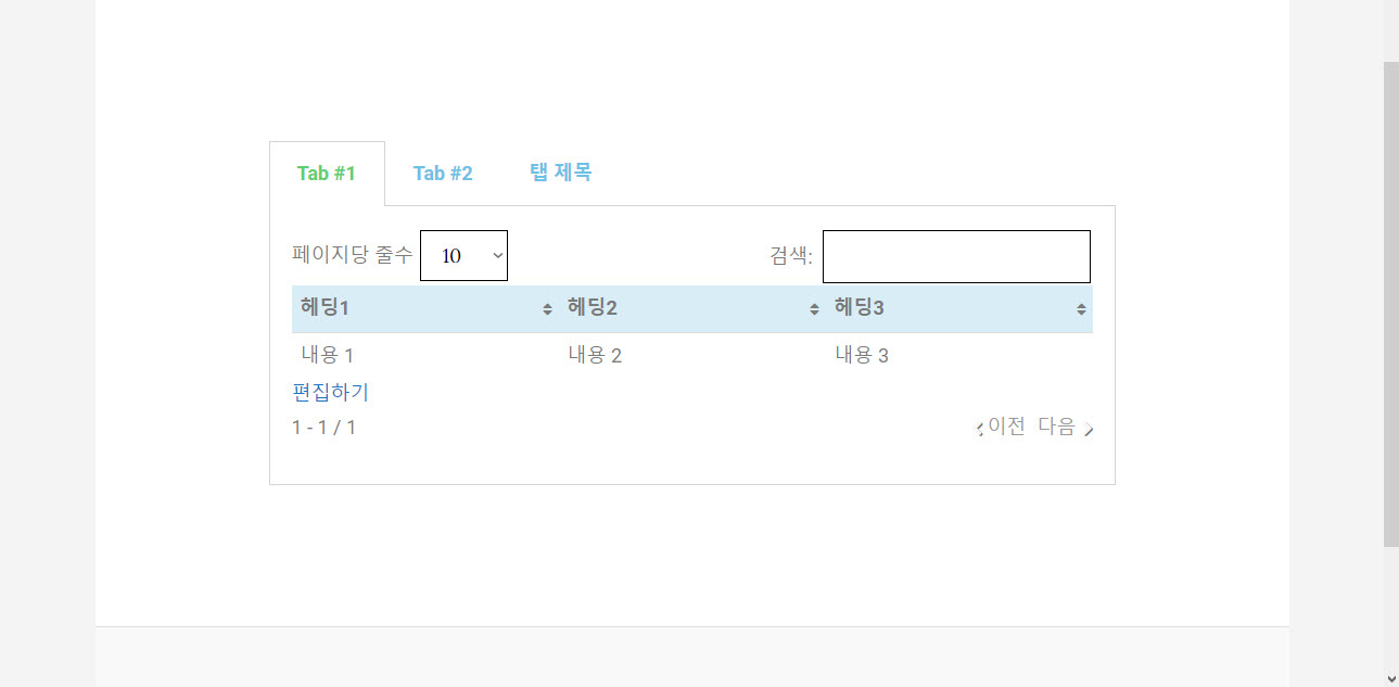 저장한 후에 실제 페이지를 살펴보면 아래와 같이 탭에서 표가 잘 작동합니다. 스타일 등을 적당히 조정하여 보기 좋게 만들 수 있습니다.